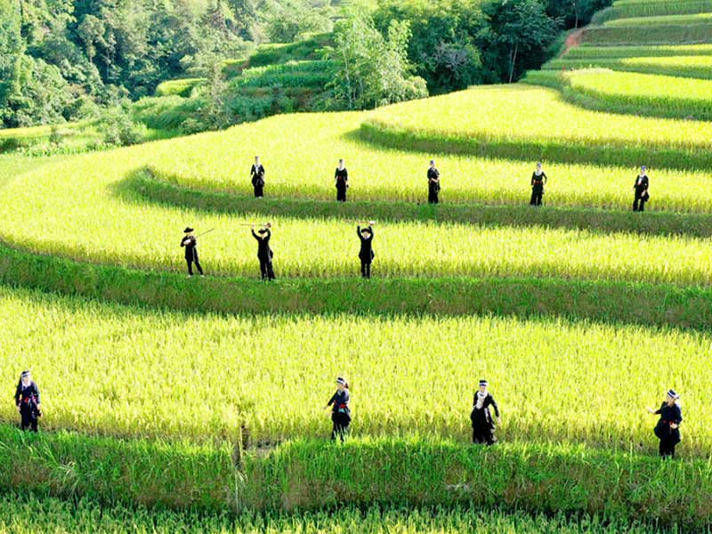 8:00 After breakfast the trek begins through a green valley and up the mountain linking Thon Tha to Khuoi My village. This is quite a hard mountain trek, but peaceful and very memorable.Today is an absolutely unforgettable trekking day, because: Khuoy My village is home to more than 62 Dao Ao Dai ethnic minority households located at the top of a mountain. Here is where the unique unspoiled nature merges with the traditional life of the local people.